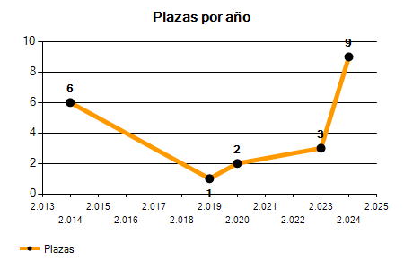 En los siguientes gráficos se puede ver la evolución del número de convocatorias y plazas convocadas para la profesión de Vigilante en Málaga de los últimos años pudiéndose observar una caída del 100,00% desde el año 2014 hasta el 2025 en número de convocatorias y una caída del 100,00% en número de plazas convocadas.