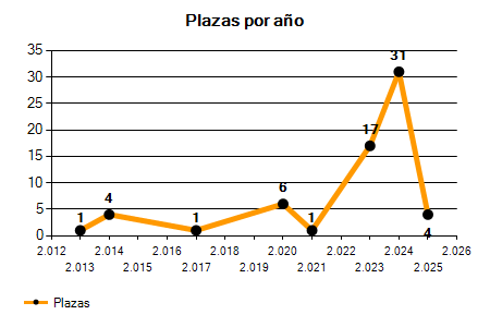 En los siguientes gráficos se puede ver la evolución del número de convocatorias y plazas convocadas para la profesión de Vigilante en Santa Cruz de Tenerife de los últimos años pudiéndose observar un crecimiento y una caída del 0,00% desde el año 2013 hasta el 2025 en número de convocatorias y un crecimiento del 300,00% en número de plazas convocadas.